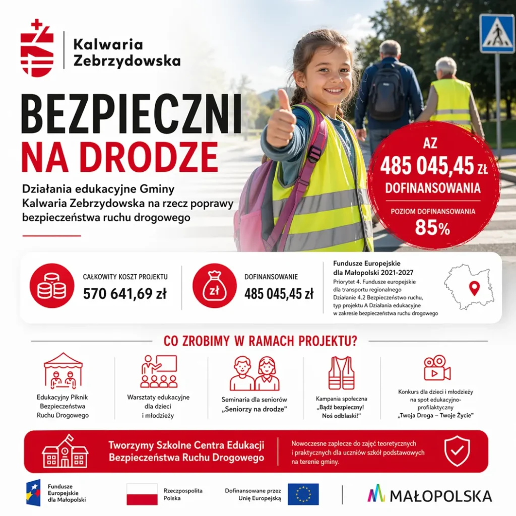 Gmina Kalwaria Zebrzydowska skutecznie sięga po środki zewnętrzne, pozyskując 485 045,45 zł dofinansowania na realizację projektu pn. „Bezpieczni na drodze” – działania edukacyjne Gminy Kalwaria Zebrzydowska na rzecz poprawy bezpieczeństwa ruchu drogowego. To aż 85% wartości całego przedsięwzięcia, które wynosi 570 641,69 zł.
