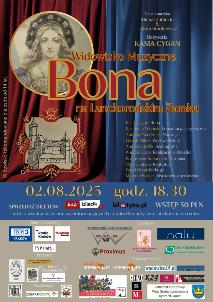 507 lat po swojej koronacji królowa Bona Sforza d’Aragona symbolicznie zawita do Lanckorony. W sobotę, 2 sierpnia, w ramach XXI Letniego Festiwalu Romantyczna Lanckorona, w odrestaurowanych ruinach zamku będzie można zobaczyć niezwykły spektakl muzyczny „Bona na lanckorońskim zamku” — opowieść o miłości, władzy i trudnych wyborach kobiety, która była Włoszką z pochodzenia, ale Polką z wyboru.