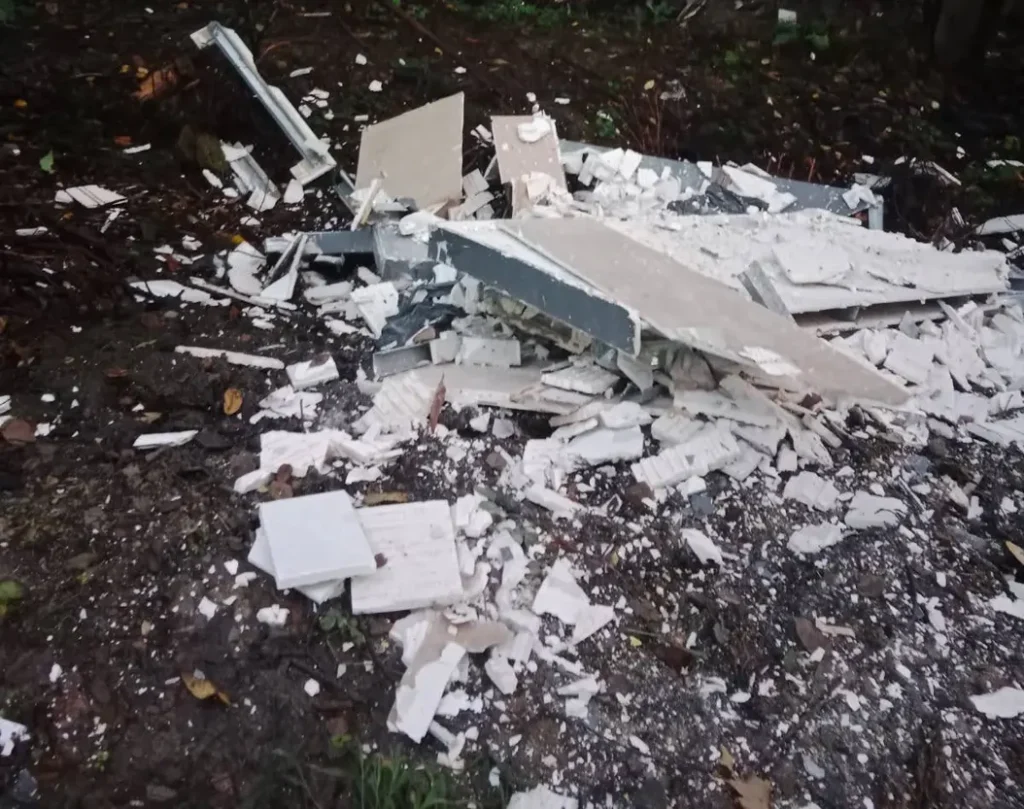 W lesie przy ulicy Łąkowej w Skawinkach (gmina Lanckorona) odkryto kolejne nielegalne wysypisko śmieci. Tym razem wśród drzew ktoś porzucił odpady poremontowe – m.in. płyty gipsowo-kartonowe – tworząc stertę na skarpie.