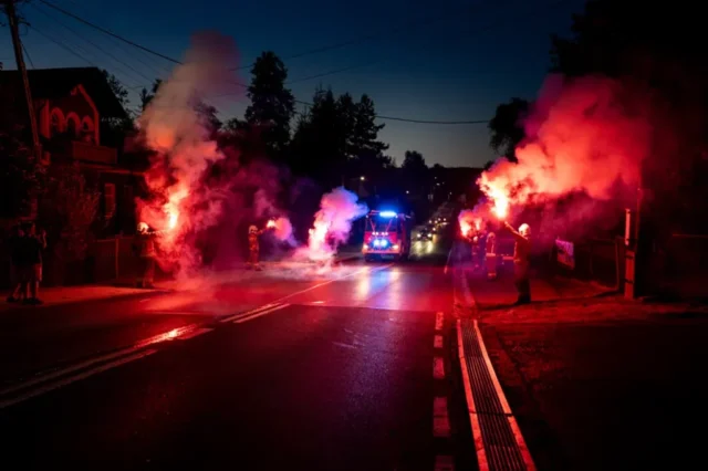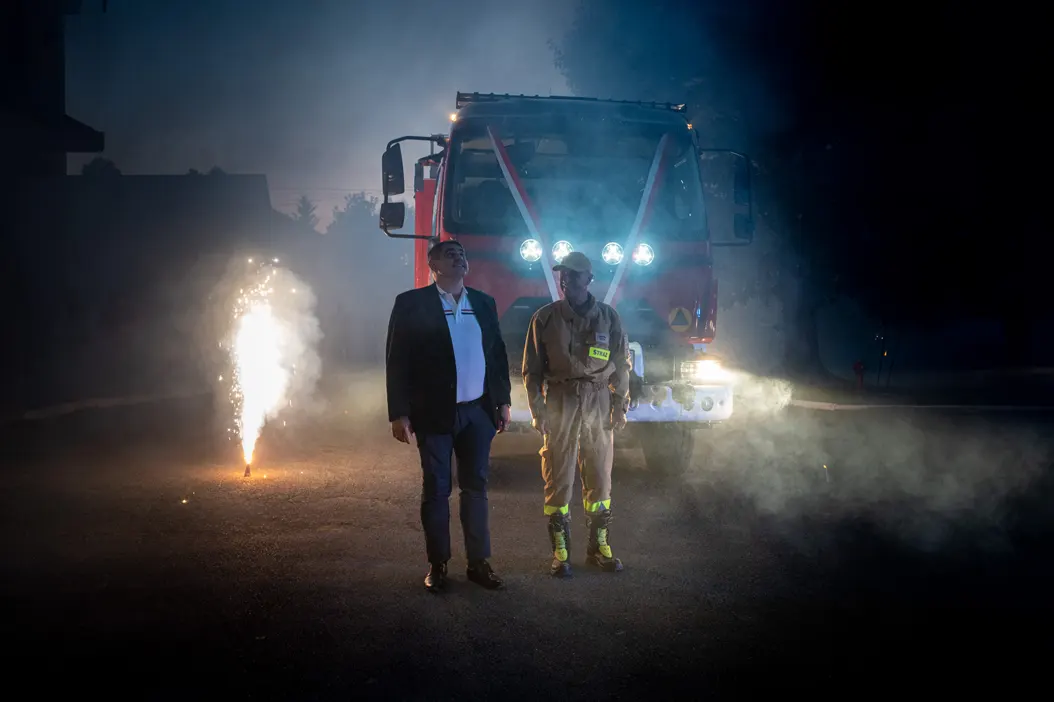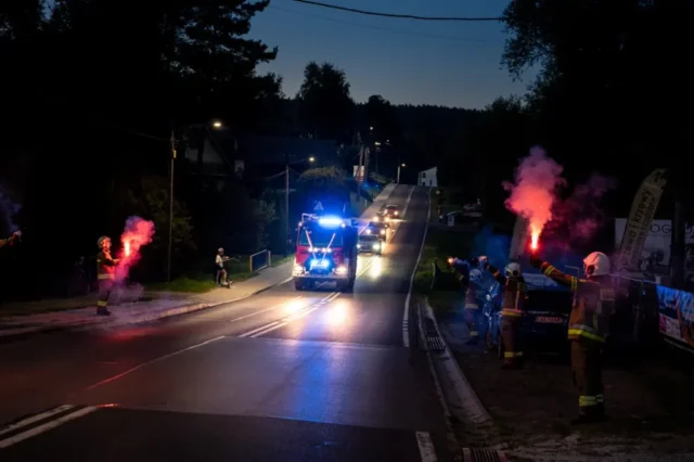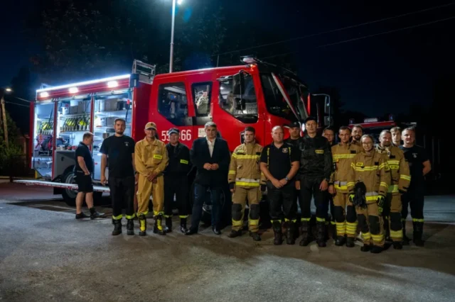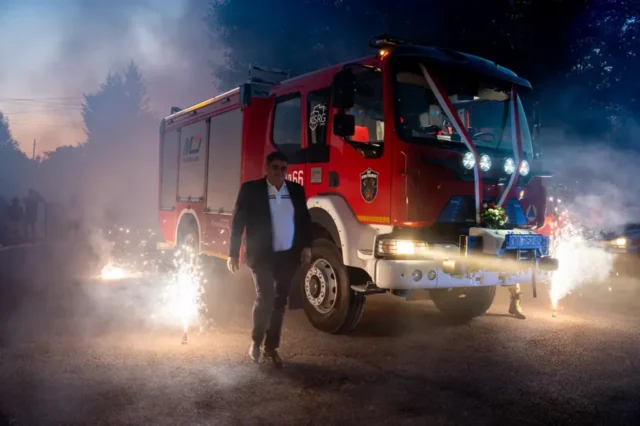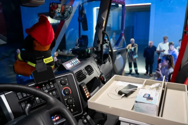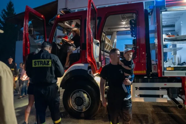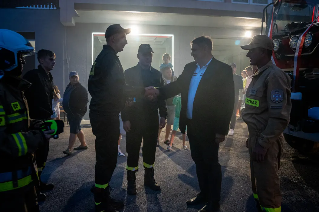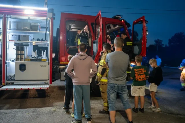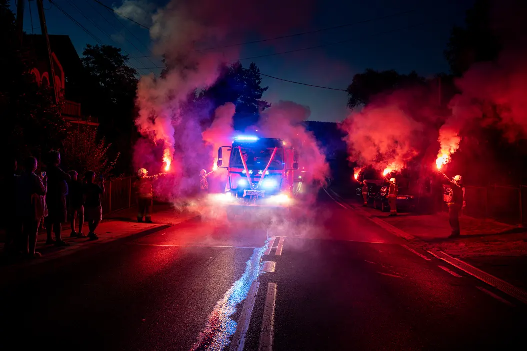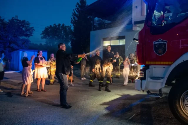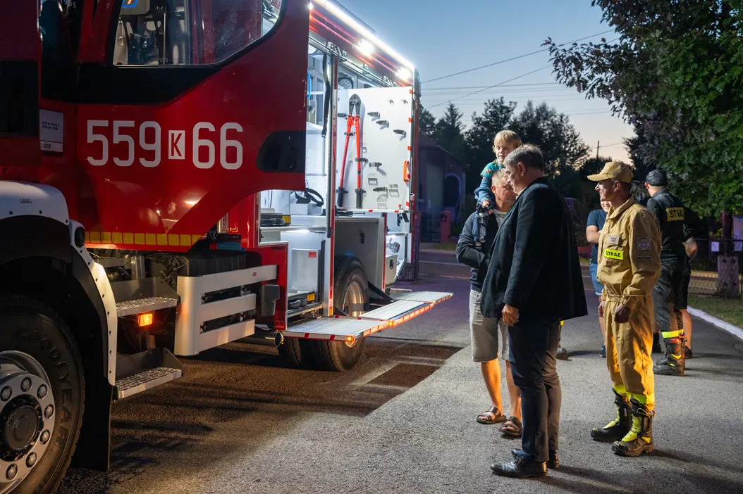 Powitanie nowego nabytku odbyło się w pełnej strażackiej oprawie – były sygnały świetlne i dźwiękowe, prezentacja możliwości pojazdu, wspólne zdjęcia oraz słodki poczęstunek przygotowany przez niezastąpione Panie z KGW Zebrzydowice.