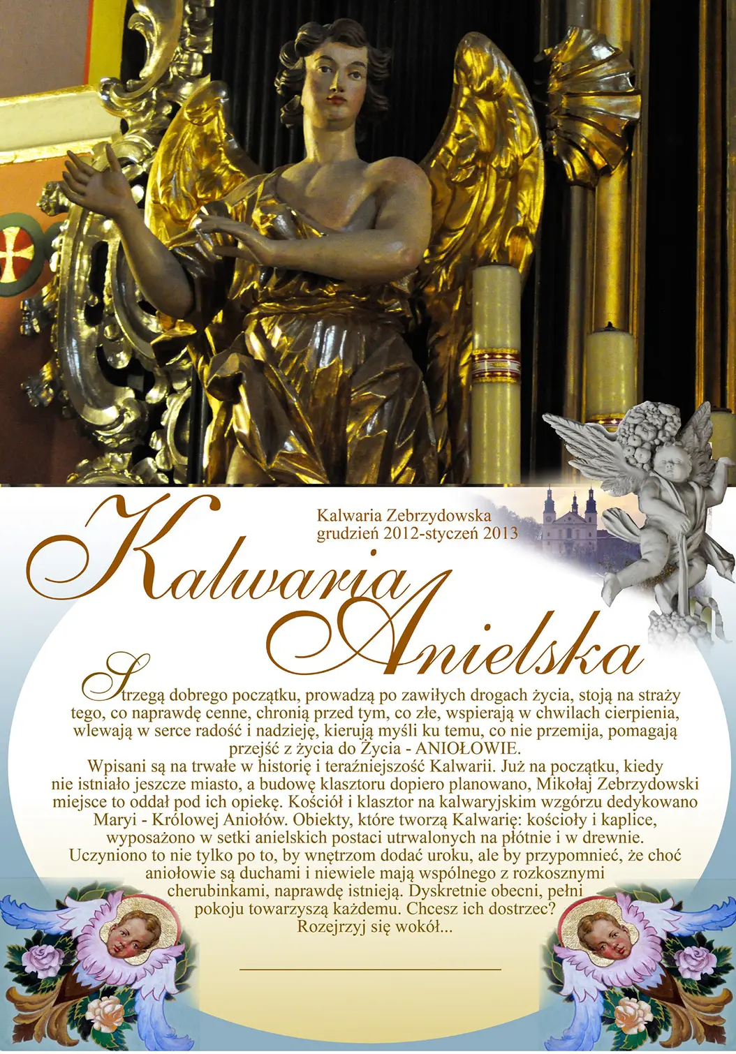 Publikacja jest efektem wystawy plenerowej zorganizowanej w 2012 roku na kalwaryjskim rynku. Jej motywem przewodnim były anioły obecne w przestrzeni miasta i okolic – zarówno te znane z sanktuarium, jak i z przydrożnych kapliczek, cmentarza czy innych miejsc regionu. Album stanowi wybór spośród kilkuset fotografii autorstwa Piotra Bieleckiego, uzupełnionych refleksyjnymi komentarzami o. Włodarczyka.