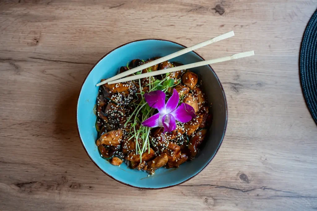 Sekret tego dania tkwi w autorskim sosie teriyaki – gęstym, lekko słodkim, z idealnie zbalansowaną nutą słoności, która podkreśla delikatność mięsa. Soczyste kawałki kurczaka zanurzone w tej wyjątkowej marynacie łączą się z cukinią, nadając lekkości i świeżości każdemu kęsowi.