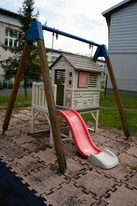 - Strefa zielona – terenowa zjeżdżalnia, huśtawki i równoważnia.