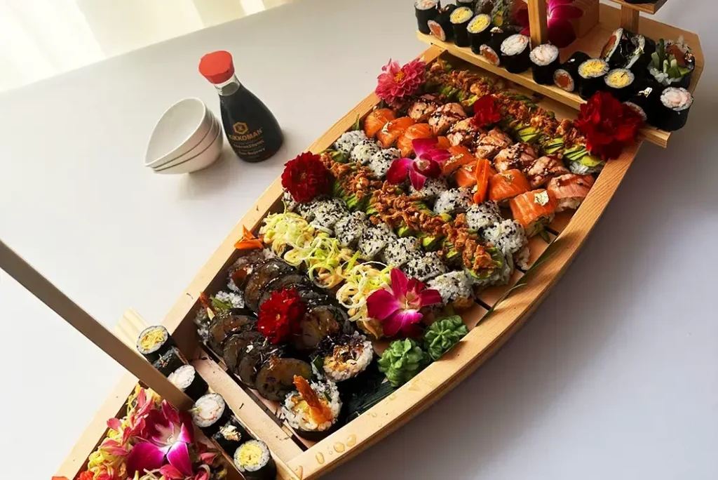 - Daje radość oczom – pięknie podane sushi, np. na dekoracji typu statek, potrafi zrobić efekt „wow” na każdej imprezie czy spotkaniu. To nie tylko uczta dla podniebienia, ale też świetny element wystroju stołu.