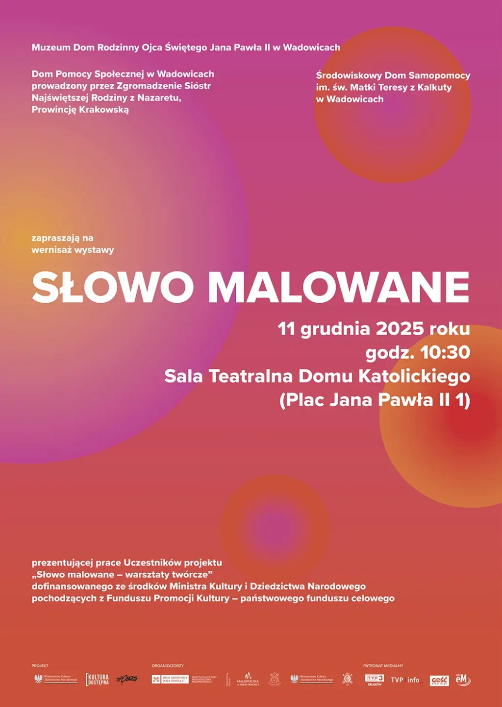 Muzeum Dom Rodzinny Ojca Świętego Jana Pawła II w Wadowicach, Dom Pomocy Społecznej prowadzony przez Zgromadzenie Sióstr Nazaretanek oraz Środowiskowy Dom Samopomocy w Wadowicach zapraszają na wernisaż wystawy „Słowo Malowane”, który odbędzie się 11 grudnia 2025 r. o godz. 10:30 w sali teatralnej Domu Katolickiego w Wadowicach (Plac Jana Pawła II 1).