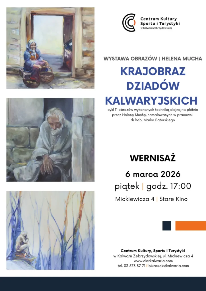 Zapraszamy na wyjątkowe spotkanie ze sztuką w ramach wernisażu cyklu „Krajobraz Dziadów kalwaryjskich” autorstwa Heleny Muchy z domu Nikolak, pochodzącej z okolicznych Brodów. Artystka jest absolwentką pierwszego stopnia Wydziału Sztuka i Edukacja Uniwersytetu Pedagogicznego w Krakowie, a obecnie kontynuuje studia II stopnia na kierunku Malarstwo. Doskonali swoje umiejętności w pracowni malarstwa Dr hab. Marka Batorskiego, przy wsparciu prof. dr hab. Piotra Jargusza, który sam fascynuje się historią okolicznych Zebrzydowic – miejsc bliskich również autorce, zwłaszcza kościoła parafialnego w pobliżu domu rodzinnego.